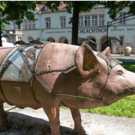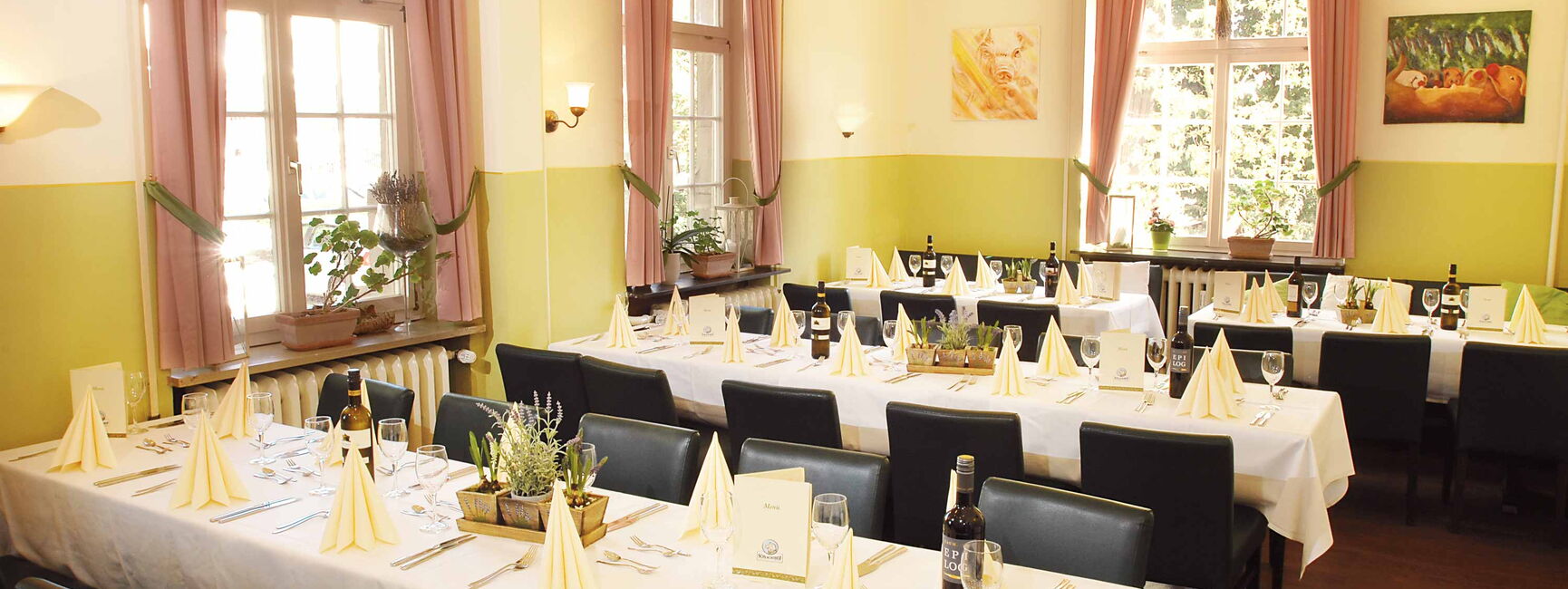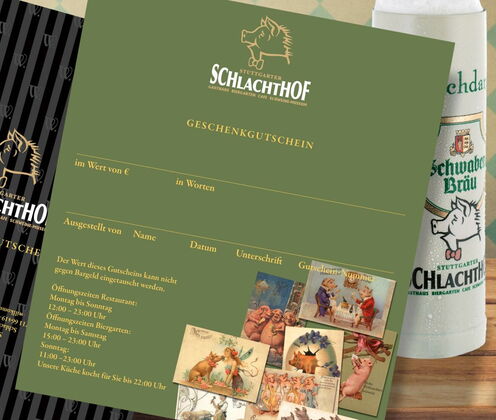 In den liebevoll eingerichteten und passend zum Thema Schweinemuseum dekorierten Räumen, dem großen rustikalen Gastraum und den beiden kleineren Räumen der Gaisburger Stube und der Neckarstube, fühlt man sich auf Anhieb sauwohl. Am Abend oder in der kühleren Jahreszeit bietet die Orangerie das angenehme Flair einer Gartenwirtschaft. In diesem dekorativen, geschützten Außenbereich lassen sich Gruppen bis zu 90 Personen ungestört bewirten.